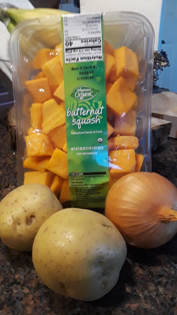 Pureed Butternut Squash Soup is one of the easiest. There are three essential ingredients: butternut squash, potatoes, onion.
