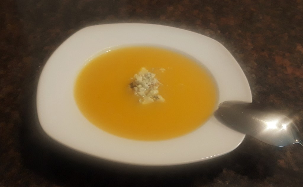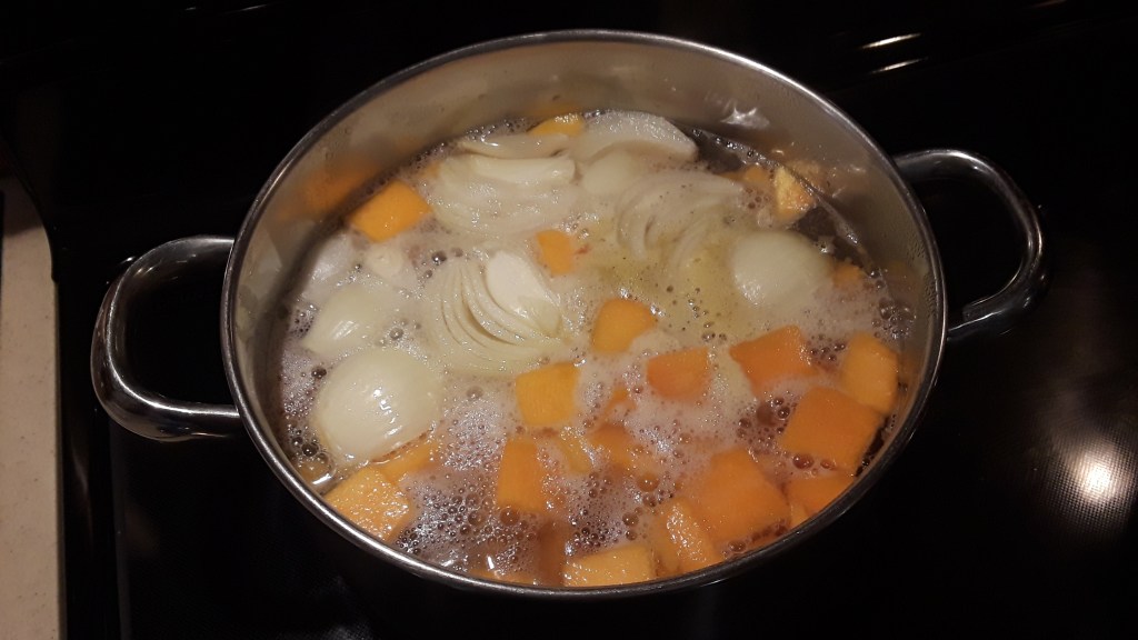 In a medium stock pot or Dutch oven, add peeled and cubed butternut squash (I highly recommend using butternut squash that is already peeled and cubed unless you have an excess of muscle power and patience), one small peeled and quartered yellow onion, and two small peeled and cubed white potatoes. Then add enough chicken or vegetable broth to cover the vegetables. (Sometimes, if I don’t have broth, I cheat and add water and a bouillon cube). Bring to a boil, reduce heat, and simmer until the potatoes are soft, about 20 minutes. Remove the pot from the heat for 10 minutes. Season with salt and pepper to taste. At this point I add a 1/4 tsp nutmeg and 1/2 c heavy cream or half and half. The soup can then be pureed directly in the pot with an immersion blender (or in a regular blender in batches and returned to the stock pot or Dutch oven). Once the soup is pureed, bring it back to a slow boil over medium low heat for about 10 minutes. Feel free to garnish with anything like toasted pistachio kernels, goat cheese crumbles, gorgonzola crumbles, or Parmigiano cheese.