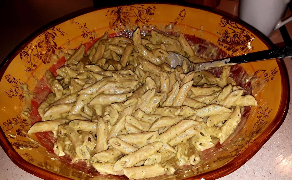 Now the hard part is waiting for the water to boil and the pasta to cook (al dente…ALWAYS!). I generally use penne for this (always a pound…with two boys anything less is laughable), but spaghetti will work just as well. Remember to save about a cup of the cooking water to thin out the pesto as you mix it with the pasta.