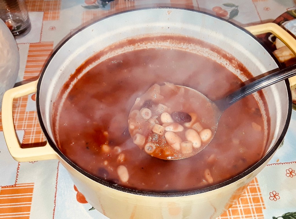 Begin with 4oz of diced pancetta or bacon. Cook on medium heat in 2Tbsp olive oil in a Dutch oven until browned or crispy. Remove the pancetta from the pot and drain on a paper towel. Set aside. Then add 1 chopped medium yellow onion to the oil in the pot and saute until soft. Add 1tsp dried Italian seasoning and 1/4 tsp dried red pepper flakes. Next, add two finely minced garlic cloves and cook for 3 minutes, stirring often. Deglaze with 1/4c white wine…scarping up all the bits on the bottom of the Dutch oven. Then add 1Qt chicken stock, 1 28oz can of peeled crushed tomatoes, 1c water, and 2 15oz cans of beans (I used 1 can of cannellini and one can of red kidney beans). Make sure to rinse the beans before adding them to the pot. Bring to a boil and then reduce heat to medium low, cover, and allow to simmer 30 minutes. Mix well and add 1c ditalini pasta. Cook 8 minutes and adjust seasoning with salt and pepper. When the pasta is cooked, sprinkle a good amount of Parmigiano on the soup and add the cooked pancetta. Give a good stir and serve with more Parmigiano and a loaf of crusty bread.