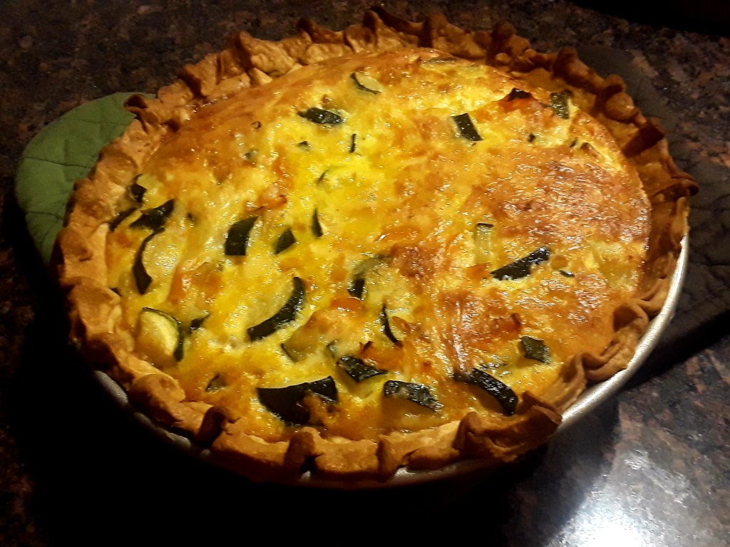 One of my favorite things to make and eat is a hearty quiche. This has got to be one of the easiest dishes to prepare and it can be made with anything you have on hand. Tonight I had some zucchini that looked like they were just a tad neglected in the vegetable drawer of my refrigerator. I grabbed a yellow pepper and a small yellow onion. After chopping the vegetables, I sautéed them in 3Tbsp of olive oil until they were soft. I added some salt, pepper, and garlic powder to taste. I took the pan off the heat and let the veggies cool a bit. In the meantime, in a large bowl I beat 5 large eggs with 1/2c half and half (only because I was out of heavy cream which is waaaayyyy better). To the egg mixture, I added 1/4c grated Parmigiano and about a cup of shredded cheddar cheese; then I seasoned with salt and pepper and added the cooled vegetables. I gave a good mix to coat the vegetables and poured them into a prepared pie crust in a deep pie dish. I put this little beauty in a 400 degree preheated oven for 15 minutes and then lower the oven temperature to 350 degrees and allow the quiche to bake for another 40 minutes.