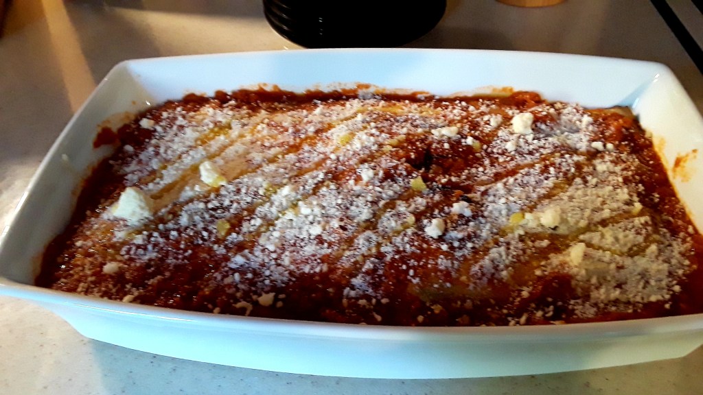 This dish is an excellent way to prepare eggplant. The basic ingredients are eggplant, tomato sauce, and mozzarella. The eggplant is peeled and sliced longways. The slices should be no more than 1/4″ thick. Place the slices on a cookie sheet lined with parchment paper and drizzle with olive oil and sprinkle on some salt. Bake at 400 degrees for about 20 minutes…until the slices begin to brown and soften. Remove from oven and allow to cool.