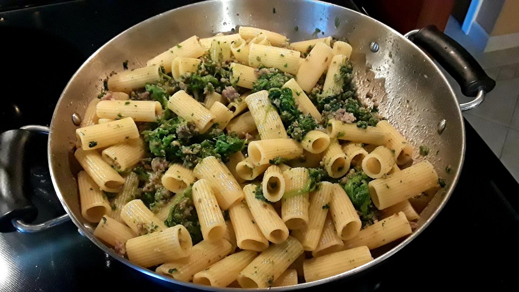 So to begin, clean and rinse a nice bunch of rapini. Thankfully, you can now find them in most grocery stores! Boil water in a medium pot and blanch the rapini for about 10 minutes. They don’t really need to cook through, they just need to get soft and tender. Using a strainer, remove the rapini and allow to drain. Keep the water that you used to blanch the rapini because you will use it to cook your pasta. Then in a large skillet, heat 3Tbsp olive oil and a large clove of garlic on medium heat. When the garlic becomes fragrant, remove it from the oil. Add 1Lb crumbled pork sausage and break it up well. When the sausage is just about cooked through, deglaze the skillet with 3/4c white wine. Season to taste with salt and pepper and allow the wine to cook down, about 15 minutes. Remove as much of the water from the rapini as possible and add them to the skillet with the sausage. Stir well. Allow to simmer for about 5 minutes and remove from heat. Cook the pasta according to package instructions and add it directly to the skillet when it is al dente. Reserve some cooking water to add to the pasta if needed. Add a generous drizzle of extra virgin olive oil and give a good toss. Serve with plenty Parmigiano. To note…this dish is typically prepared using Orecchiette pasta…but good luck trying to find that at the grocery store these days…so Rigatoni it is!