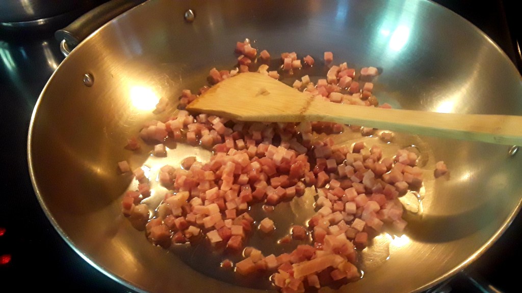 Put on a pot of water for the pasta (I used a pound of pasta). Place the cubed pancetta (4oz) in a large skillet with 1Tbsp olive oil and allow it to brown on medium-low heat.