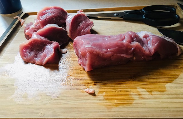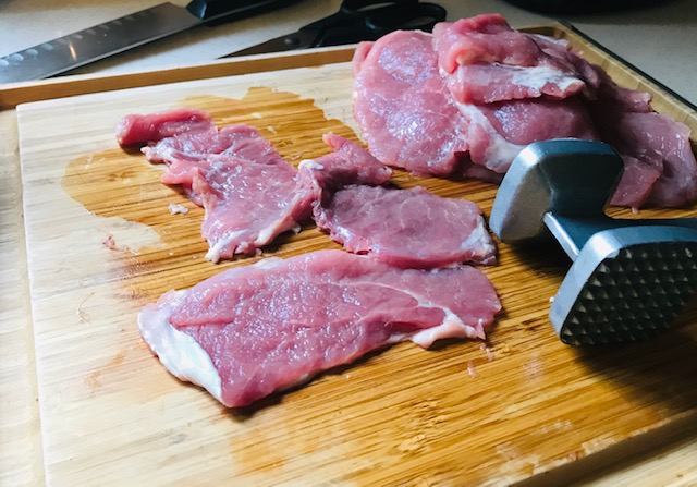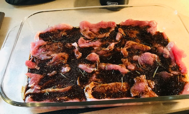 Tonight I decided to make my own marinade. For this recipe, the pork tenderloin is cut into 1/4″ thick slices and then flattened with a meat mallet….be gentle as it does not take much to pound the slices flat.