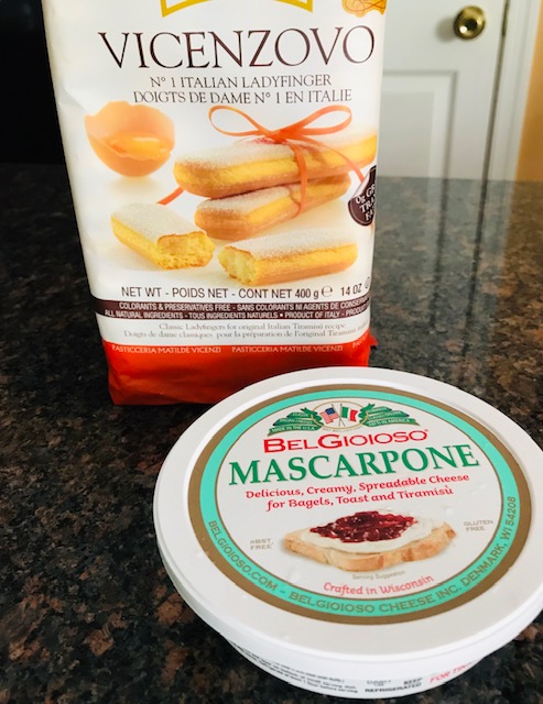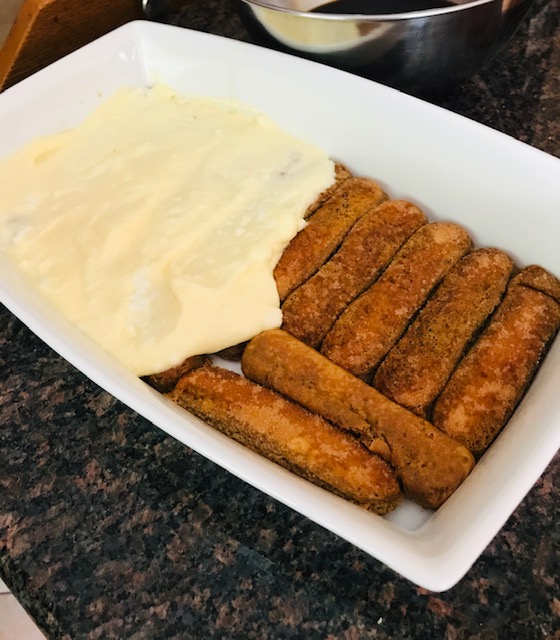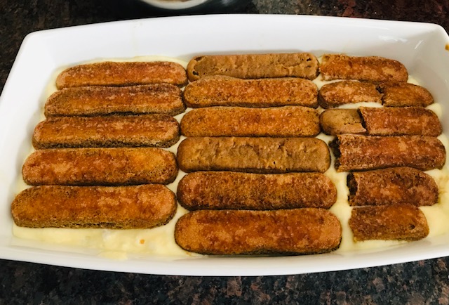 To assemble, use an 8×10 baking dish, and place one layer of lady fingers that have been quickly dipped in the cooled coffee. Add half the egg mixture and spread to cover the lady fingers completely.