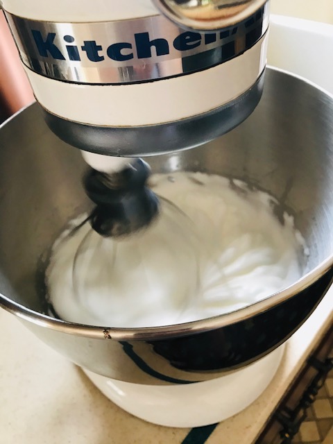 Next separate six eggs. Place the whites in the bowl of a stand mixer and beat until soft peaks form.