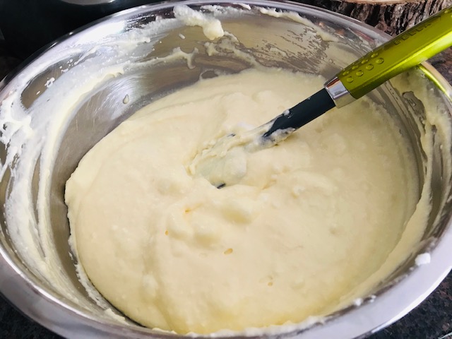 To this mixture carefully fold in half of the beaten egg whites until incorporated, and then add the remaining egg whites and continue to fold to combine.