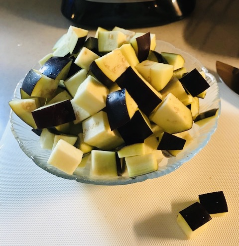 To begin, trim the ends off a medium sized eggplant and cut it into cubes. Set aside.