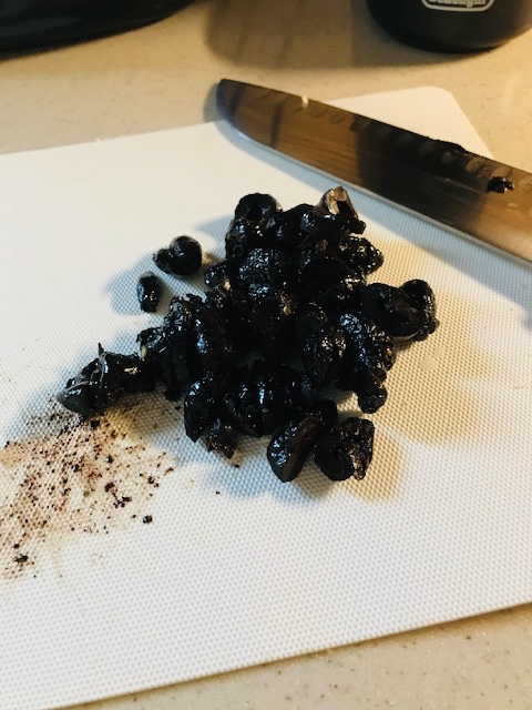 Add one minced garlic clove and stir well. Then season with salt and pepper. Cook another minute or two and add the cubed eggplant with 3/4c white wine. Give a good stir and partially cover the pan with a lid. Allow the wine to reduce somewhat and the eggplant to become soft..about 10 to 15 minutes. (The eggplant is cooked when it feels soft and breaks apart when pushed with a wooden spoon). Adjust seasoning as needed. Finally add 1/4c pitted oil- cured olives (always have some on hand).