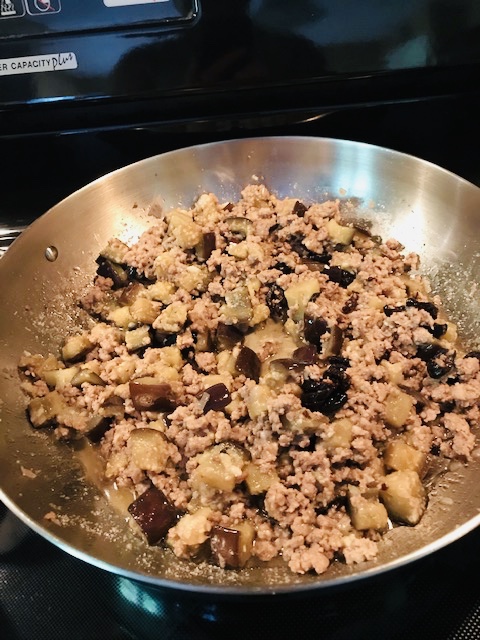 One pot meals that feature veggies, carbs, and proteins are a must. This is one of those dishes! It came to be by chance, when one night I had very little on hand, and I had no idea what to make for dinner. I had one lonesome eggplant, some ground pork, and pasta (always). The next thing I know, this dish is on the Marcantoni Family Favorites List.