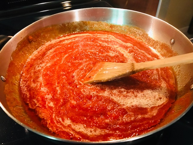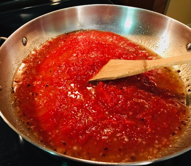 This sauce can be made a number of ways. My favorite is using fresh tomatoes that are steam peeled, seeded, and roughly chopped. But it’s Friday. I have had a long week, and I am not about to steam peel and seed tomatoes. Soooooo….canned crushed tomatoes it is!