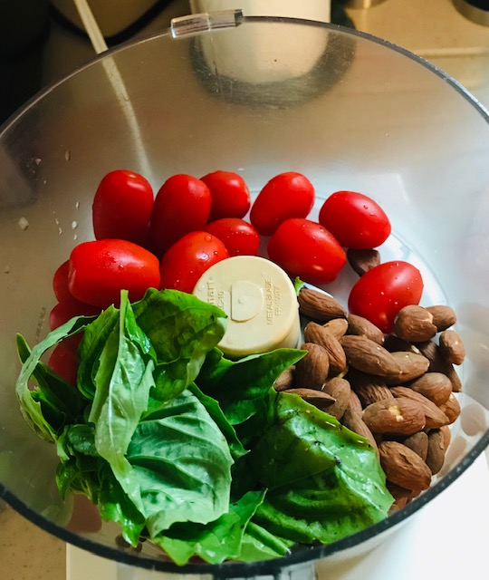 When I make this, I measure nothing. I literally use a handful of unsalted almonds (roasted or not), a handful of fresh basil leaves, and two handfuls of cherry or grape tomatoes. Place in the bowl of a food processor.