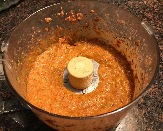 Season with salt and pepper. Also add a generous handful or two of freshly grated Parmigiano…which I forgot to do last night….cooking with a headache…UGH! Process until combined. With the machine running, I also add a good drizzle of extra virgin olive oil…only enough to loosen the pesto and make it a bit less chunky. That’s it!