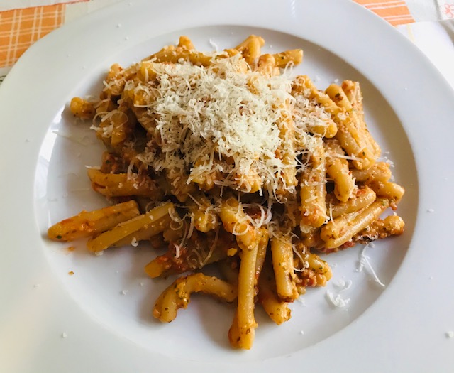 Give a good stir and remove from heat. Finish it off with 1 and 1/2c grated Parmigiano. Serve over rigatoni, penne, or farfalle…remember to save some of the cooking water to thin out the sauce when adding the pasta.