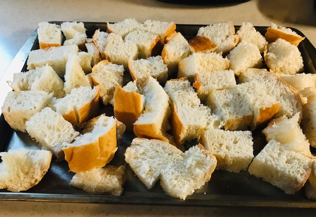 While the vegetables are roasting. Cut a loaf of crusty bread into five or six thick slices and then cube each of the slices. Place on another cookie sheet and put in the oven with the vegetables. Cook until the bread cubes are browned a bit, about 15 minutes.
